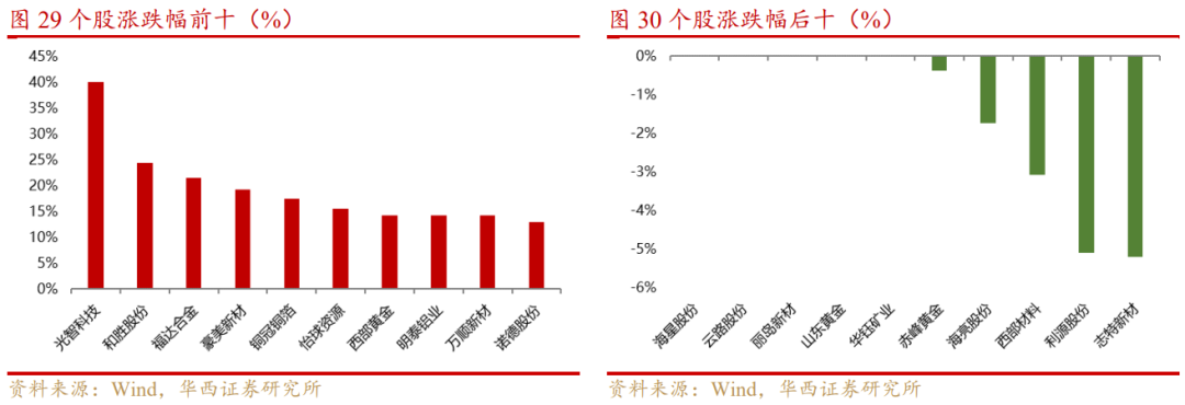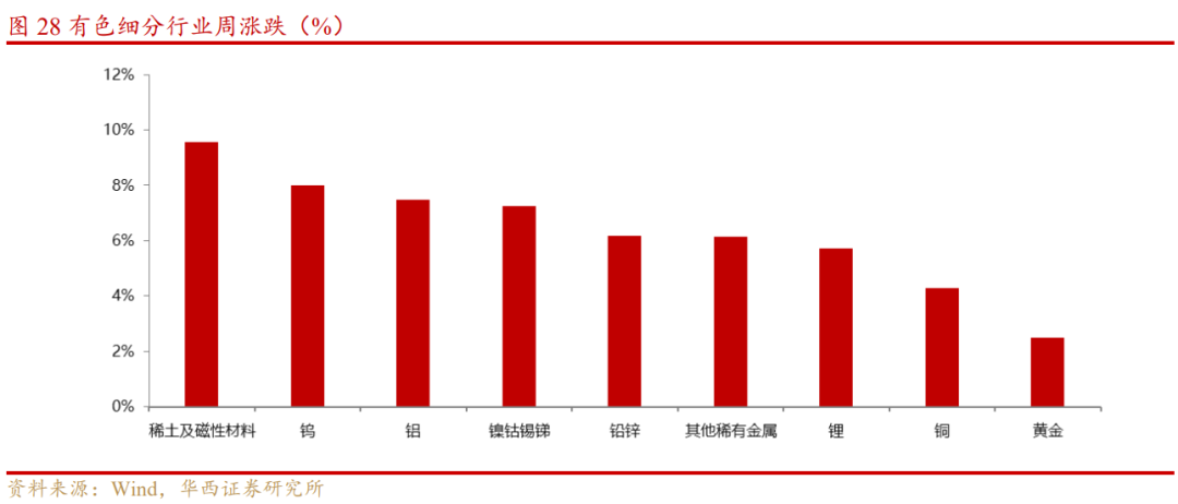 从细分行业看,稀土及磁性材料、钨、铝、镍钴锡锑、铅锌、其他稀有金属、锂、铜、黄金分别上涨9.55%、8.00%、7.47%、7.25%、6.17%、6.13%、5.70%、4.30%、2.48%