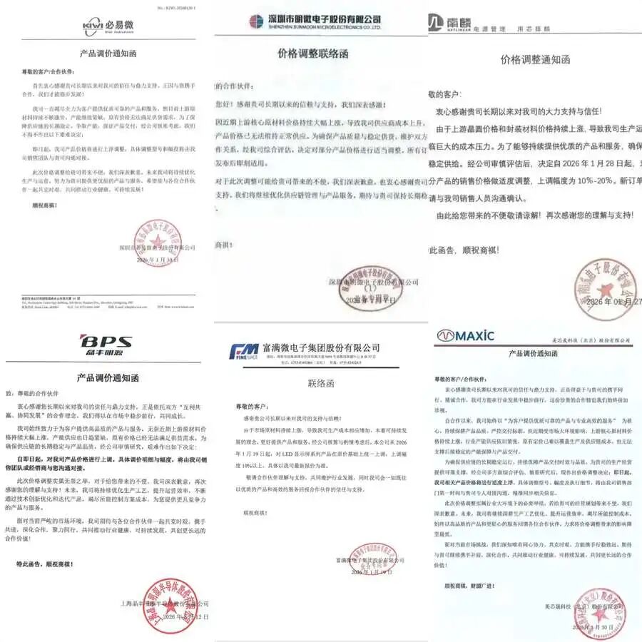 1月19日,富满微电子率先发布调价通知。随后,必易微、美芯晟、南麟电子、明微电子、晶丰明源五家头部企业相继跟进。短短两个月内,国内LED驱动芯片核心阵营完成“全员涨价”,涨幅普遍在10%-20%之间,部分高端产品涨幅突破25%。