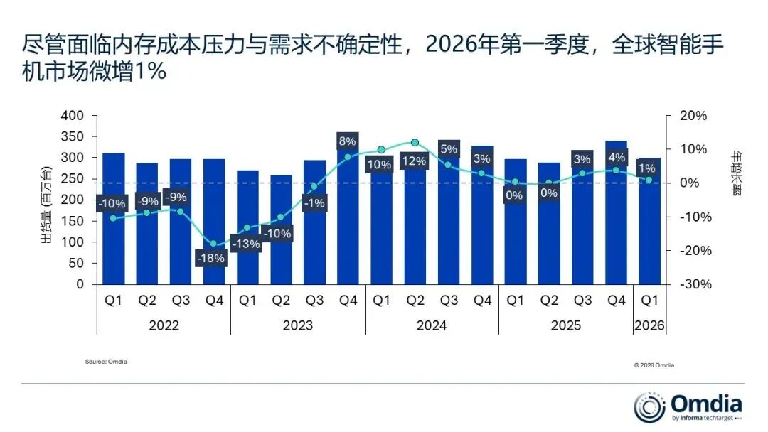 根据Omdia最新发布的研究报告,2026年第一季度全球智能手机市场交出了一份看似“超预期”的成绩单——出货量同比增长1%。然而,拨开数据的迷雾,这并非市场回暖的信号,而是一场由供应链焦虑引发的短期“虚火”。
