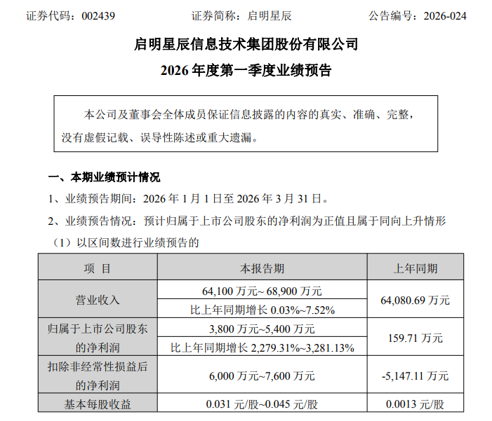 启明星辰(002439)预计2026年第一季度实现营业收入6.41亿元至6.89亿元,同比增长0.03%至7.52%;净利润3800万元至5400万元,同比增长2279.31%至3281.13%。