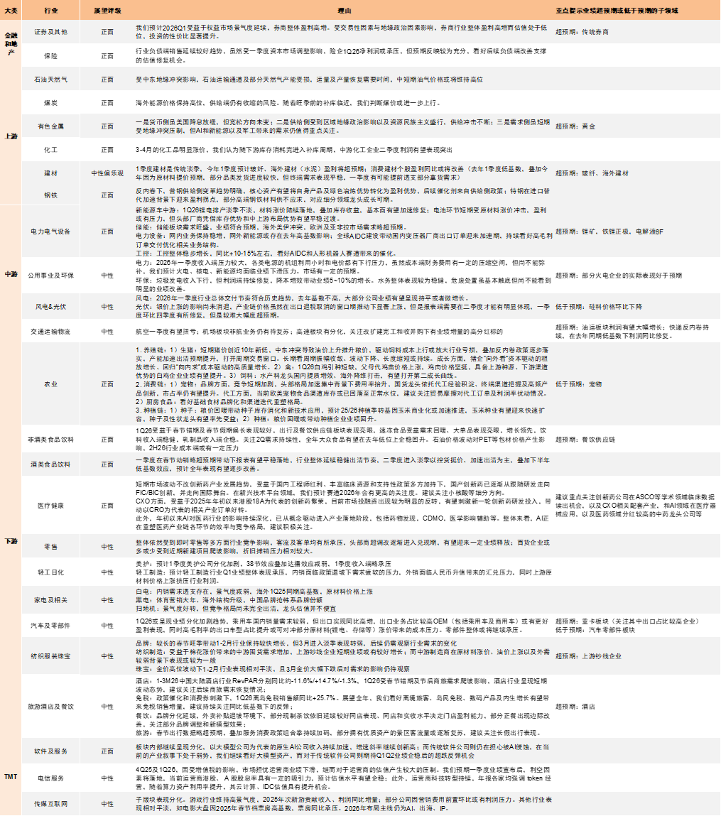 细分领域有哪些亮点?结合中金行业分析师自下而上反馈:1)能源、原材料行业:受中东地缘冲突影响,石油及天然气产能受损,中短期价格预计维持高位,化工品明显涨价,叠加下游进入补库周期,板块有望实现较好业绩表现;海外能源价格维持高位,叠加旺季补库临近,煤价或进一步上行;有色金属板块受益于美联储宽松方向以及供需的双重提振,黄金板块业绩有望超预期;普钢供给侧改革趋势明朗,特钢在进口替代加速背景下迎来盈利拐点;地产基建需求仍相对偏弱,但去年低基数叠加原材料提价预期,部分消费建材盈利预计改善,玻纤、海外建材有望超预期。2)中游制造:电力新能源方面,一季度锂电材料涨价落地,叠加库存收益,基本面有望修复,电池短期或受原材料涨价冲击,但头部厂商有望平稳过渡;储能需求旺盛,美伊冲突下海外需求略超预期;电网国内业务保持稳增,海外或存在去年高基数影响,全球AIDC建设带动出口订单迎来加速期;工控稳步增长,看好AIDC和人形机器人带来的催化。风电交付节奏符合历史趋势,多数公司业绩持平或微增。光伏产业链方面,银价上涨影响暂未消退,出口退税取消窗口期推动产业链价格上行,但预计二季度报表体现。公用事业方面,电力收入端压力增加,成本压缩尚不能弥补;垃圾发电收入下行,但降本增效带动业绩改善,水务整体稳健。交运方面,航空有望扭亏,机场板块非航业务有待复苏,高速板块存在分化,油运板块利润有望大幅增长,快递受益于反内卷叠加低基数,利润预计修复。有望超预期的领域包括:锂矿,铁锂正极,电解液6F,油运,快递。3)下游消费:春节错位以及假期偏长提振餐饮供应链、出行、酒店、旅游等板块表现,酒类春节动销略超预期,但内需环境整体偏弱,零售、白电内销、纺服珠宝、轻工日化等业绩表现平淡。汽车内销偏弱,但出口同比高增,出口业务占比较高OEM或有更好盈利表现。医疗板块中创新药投融资明显反转,有望刺激新一轮研发投入,带动订单好转,AI对产业链效率及竞争格局重塑影响需积极关注。农业养殖链中短期猪价创近10年新低且中东冲突驱动饲料成本上行,但叠加反内卷逐步落实,有望打开周期交易窗口,禽类及饲料经营改善;宠物竞争短期加剧,费用率抬升,业绩或低于预期;粮价回暖利好种植链企业。4)TMT: 传媒方面,子板块表现分化,游戏行业维持高景气度,但其余领域表现相对平淡,AI、出海、IP预计仍为2026年主线。软件方面,板块内部分化,以大模型公司为代表的原生AI公司收入持续加速,而传统软件公司存在被AI侵蚀担忧。电信服务方面,去年四季度至今受增值税影响,市场担忧运营商业绩下滑,未来伴随科技转型持续,算力资产利用率有望提升。5)金融地产:受益于权益市场景气度,券商整体盈利高增;保险负债端销售延续较好趋势,但净利润受市场调整影响相对承压。