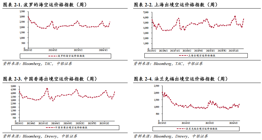 航空货运价格:截至2026年4月8日,上海出境空运价格指数报价5689.00点,同比 21.3%,环比 6.4%。波罗的海空运价格指数报价2519.00点,同比 15.8%,环比 5.1%;中国香港出境空运价格指数报价4205.00点,同比 13.4%,环比 8.6%;法兰克福空运价格指数报价1173.00点,同比 6.1%,环比-2.1%。