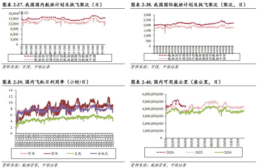 2026年2月南航、国航、东航、吉祥、春秋、海航ASK已超19年同期。可用座公里(ASK)方面,2026年2月,南航、国航、东航可用座公里分别相对去年同比增长 14.39%、 13.81%、 12.79%,恢复至19年同期的201.16%、305.29%、226.65%;吉祥、春秋、海航1月可用座公里恢复至19年同期的158.44%、150.02%、221.68%,部分航司已远超疫情前水平。收入客公里(RPK)方面,南航、国航、海航、吉祥2月收入客公里分别同比 0.80%、 13.83%、 19.09%、 8.88%,南航、国航、海航、吉祥已恢复至19年同期的103.27%、254.40%、407.13%、265.92%。