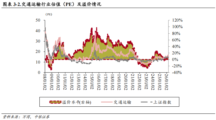 截至2026年4月10日,交通运输行业市盈率为15.86倍(TTM),上证A股为14.57倍。