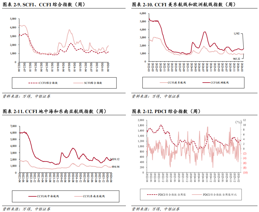 干散货:BDI指数环比上升8.42%,报收2201点。2026年4月10日,波罗的海干散货指数(BDI)报收2201点,周环比 8.42%,同比 64.01%,分船型看,巴拿马型、海岬型、轻便型、轻便极限型运价指数分别报收1855/3318/699/1308点,环比 5.52%/ 9.76%/ 0.43%/ 8.19%,同比 45.15%/ 73.26%/ 16.50%/ 37.11%。我们认为BDI中长期走势需要观察全球工业经济恢复情况,可以持续动态跟踪世界钢铁产量、澳大利亚和巴西铁矿石出口、中国煤炭进口等指标。