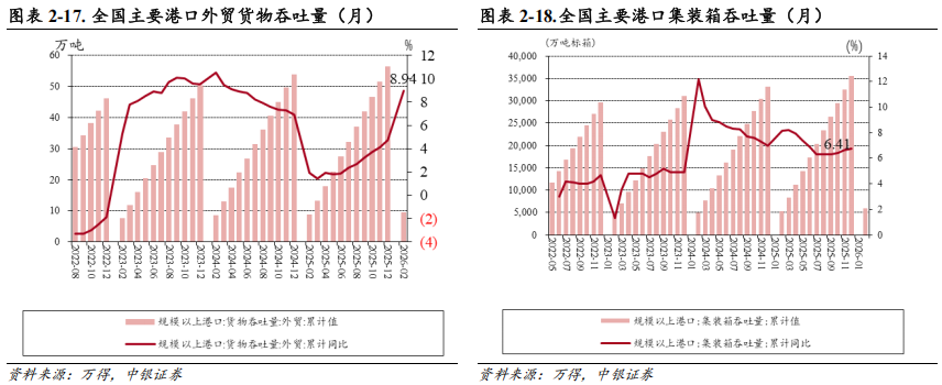 2.2.2量:2026年1-2月全国港口货物、集装箱吞吐量分别为28.68亿吨/5877万标箱