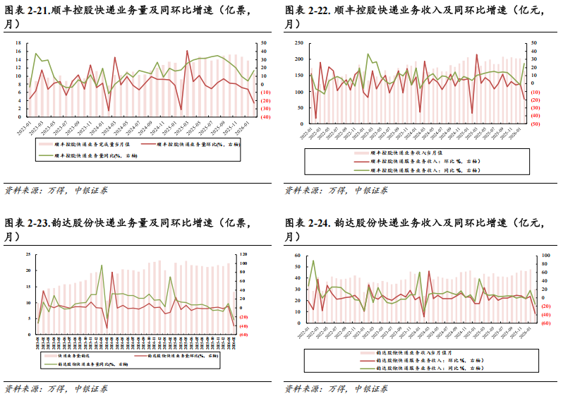 圆通速递:2026年2月单票价格2.40元,同比 3.45%( 0.08元),环比 6.67%( 0.15元)。