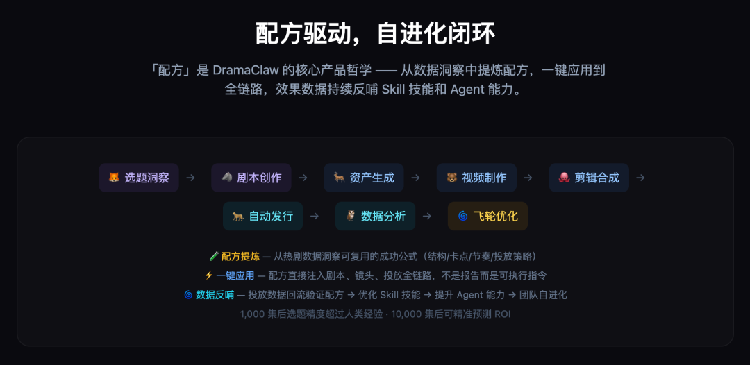 其重点在于,将成功的爆款内容拆解为可量化、可复制的“配方”,从海量数据中提炼选题、节奏、人设、转折点的成功概率模型,创作者可以将经过市场验证的“配方”应用于剧本生成到最终分发的全链路,大幅提升内容变现的成功率。