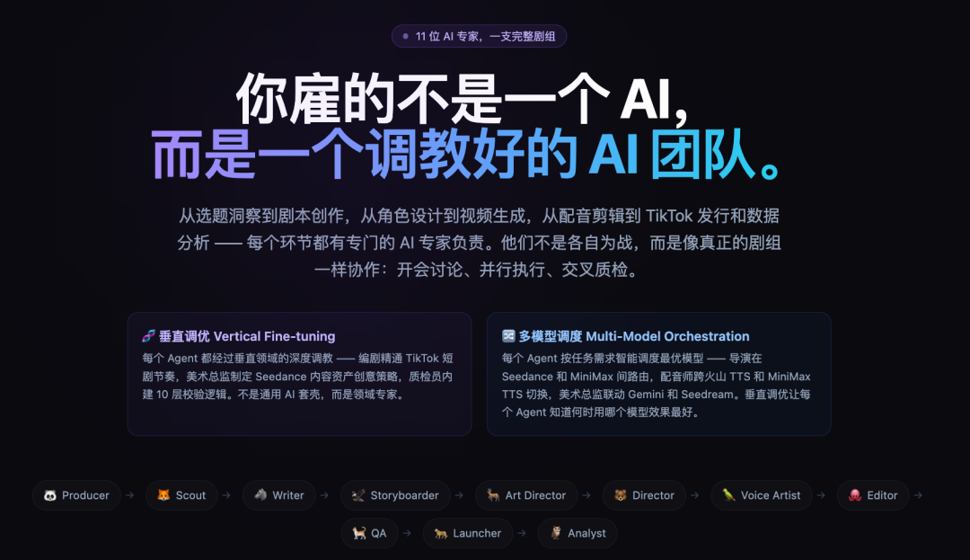 分镜师将剧本转化为精确的分镜脚本,控制0-3秒/3-10秒/10-30秒的镜头节奏;美术总监生成角色和场景资产,确保跨镜头视觉一致性;视频导演调度 Seedance 等视频生成模型,将静态画面转化为动态影像;配音师整合159种 AI 声线进行角色配音;剪辑师自动合成最终成片。