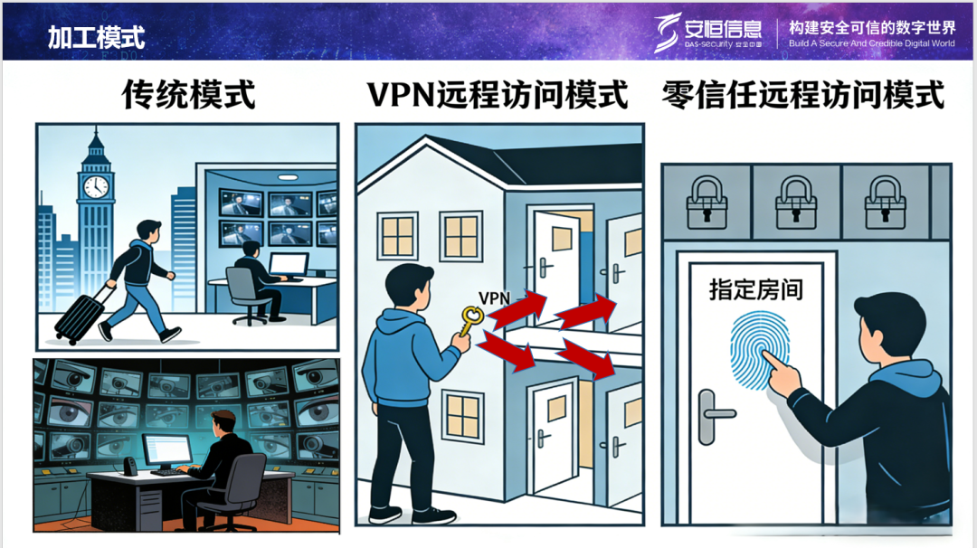 传统路径无非两条。第一条:人到现场。 工程师到对方办公地,在隔离环境里干活,全程被摄像头盯着。效率低到发指,成本高到肉疼,一个需求动辄数月。第二条:远程VPN。 本质是“开门工具”——只负责打通网络,至于谁进来、做什么、带走什么,一概不管。权限粗放、传输不安全、无全流程适配、无信任机制,四大硬伤让VPN在数据远程加工场景形同虚设。一旦出事,连谁干的都说不清。