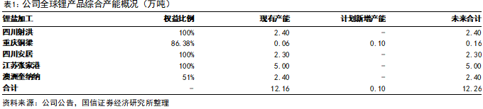 产品端,公司现已建成投产锂化工产品生产基地共6个,已建成综合锂化工产品产能合计12.16万吨。国内基地方面:1)四川射洪生产基地产能2.4万吨/年,含有碳酸锂产能1.45万吨/年,氢氧化锂产能5000吨/年,氯化锂产能4500吨/年;2)江苏张家港包括碳酸锂和氢氧化锂两个基地,碳酸锂产能2万吨/年是全球首条在成熟运营中的全自动化电池级碳酸锂工厂,氢氧化锂产能3万吨/年目前正处在生产爬坡状态;3)重庆铜梁生产基地主要从事金属锂产品的研发和生产,产能600吨/年,铜梁基地拟扩建1000吨金属锂项目;4)四川遂宁安居工厂2.3万吨/年碳酸锂项目目前处于满产运营状态。国外基地方面:澳大利亚奎纳纳工厂(一期氢氧化锂项目)是全球首条投入运营的全自动化电池级氢氧化锂工厂,目前建成电池级氢氧化锂产能2.4万吨/年,仍处于爬坡阶段。