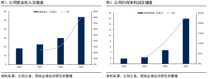 公司发布2025年业绩报告:实现营收53.83亿美元,同比 80.05%;实现归母净利润16.02亿美元,同比 232.71%,其中公司于25Q4实现归母净利润6.97亿美元。公司此前已发布过2025年业绩预告,预告业绩区间在15-16亿美元,实际业绩在预告上限,兑现度高。