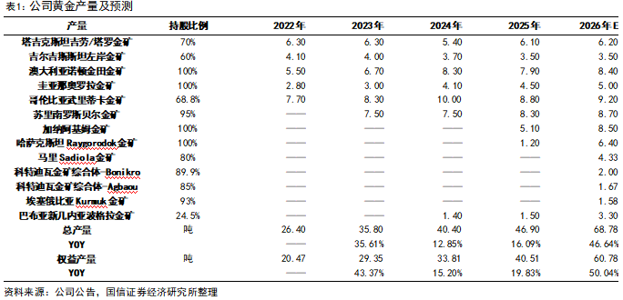 黄金产量方面:公司2025年实现黄金产量约46.9吨(其中控股矿山约45.4吨),同比增加约20%。公司2026年产量计划约59.2吨,同比增加约26%,这其中未考虑公司拟并购联合黄金100%股权所带来的增量的部分。公司2026年黄金产量将有望继续实现高增长。