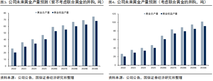 “内生增长 外延并购”,未来黄金产量有望持续快速增长:1)加纳阿基姆金矿,项目正就新增300万吨/年处理量技改工程进行论证研究,未来整体采选规模有望提升至1300万吨/年,年产金量有望提升至13吨以上;2)哈萨克斯坦瑞果多金矿,项目正就新增1000万吨/年处理量技改工程进行论证研究,未来整体采选规模有望提升至1600万吨/年,年产金量有望提升至约11吨;3)苏里南罗斯贝尔金矿,项目将实施新增500万吨/年处理量的技改扩建,未来整体采选规模有望提升至1800万吨/年,年产金量有望提升至约12吨;4)圭亚那奥罗拉金矿,地采工程一期按计划顺利实施,将逐步实现由露天开采向地下开采的平稳过渡,达产后年产金量约6吨;5)公司于2026年1月公告,拟以约55亿加元(约合人民币280亿元)对价,收购联合黄金100%股权。联合黄金核心资产包括在产的马里Sadiola金矿、科特迪瓦金矿综合体(含Bonikro和Agbaou金矿)及将于2026年下半年建成投产的埃塞俄比亚Kurmuk金矿。联合黄金预计2025年产金11.7-12.4吨;依托Sadiola项目改扩建及Kurmuk项目建成投产,预计2029年产金将提升至25吨。综合来看,公司多措并举有效保障了中长期的成长性;另外根据我们的测算,若考虑联合黄金的并购,公司在2030年黄金产量有望突破100吨,未来5年的年均复合增速有望达到16-17%。