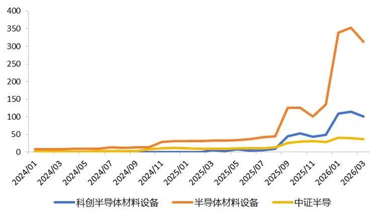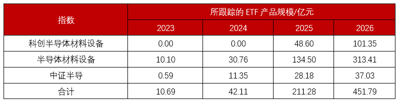从2023年至2026年的数据来看,半导体设备相关ETF产品规模呈现爆发式增长,总规模从10.69亿元激增至451.79亿元,三年间增长超40倍,反映出市场对半导体赛道的高度关注和资金持续涌入。