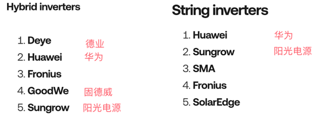 与组件市场不同,逆变器领域的顶级品牌基本保持不变,德业仍是混合逆变器领域的领军企业,华为则继续占据组串式逆变器榜首位置。
