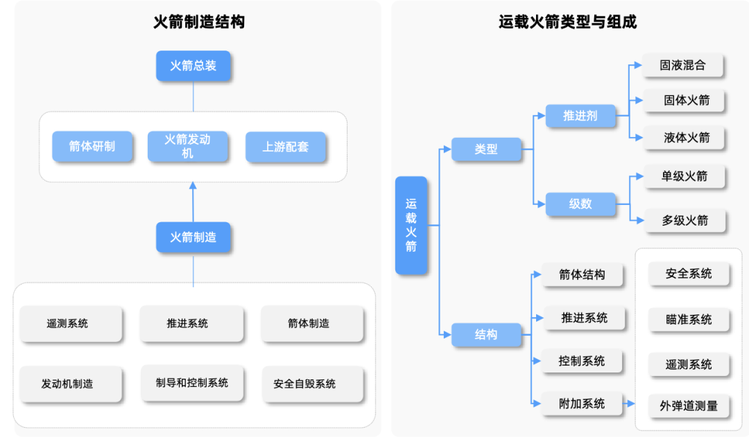 火箭系统主要包括推进系统、箭体制造、遥测系统、发动机制造、制导和控制系统以及安全自毁系统。