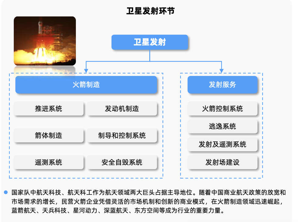 卫星发射环节主要由火箭制造和发射服务组成。