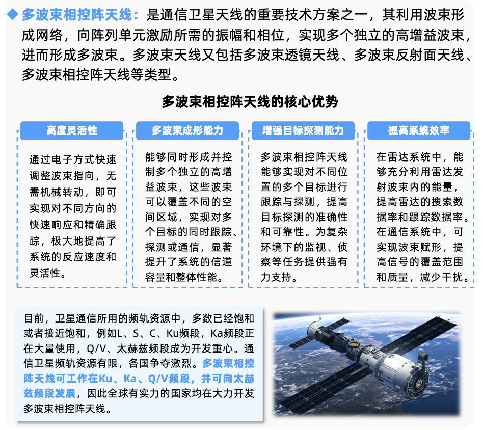 多波束相控阵天线技术:使得卫星能够同时与多个地面站或卫星进行通信,极大地提高了通信容量和灵活性。