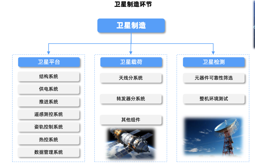 卫星制造是商业航天产业链中的核心环节,主要主要包括卫星平台、卫星载荷。