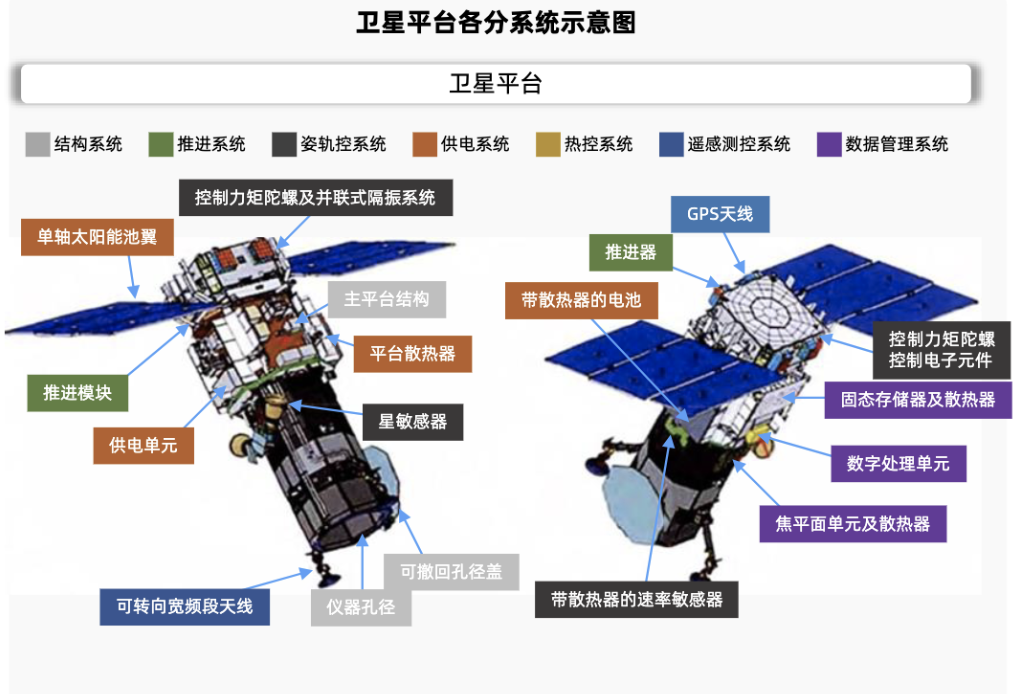 卫星平台的主要功能是保障卫星和有效载荷在空间正常工作的系统,包括控制、推进、结构等多个分系统。