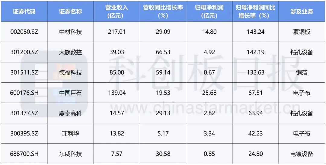 除生益电子外,截至目前还有部分PCB产业链公司发布三季报。据《科创板日报》统计,7家公司今年前三季度均实现营业收入及归母净利润双增。其中,中材科技、大族数控、德福科技三家公司今年前三季度归母净利润实现130%以上增速。从涉及业务来看,7家公司均属于PCB产业链的上游领域。