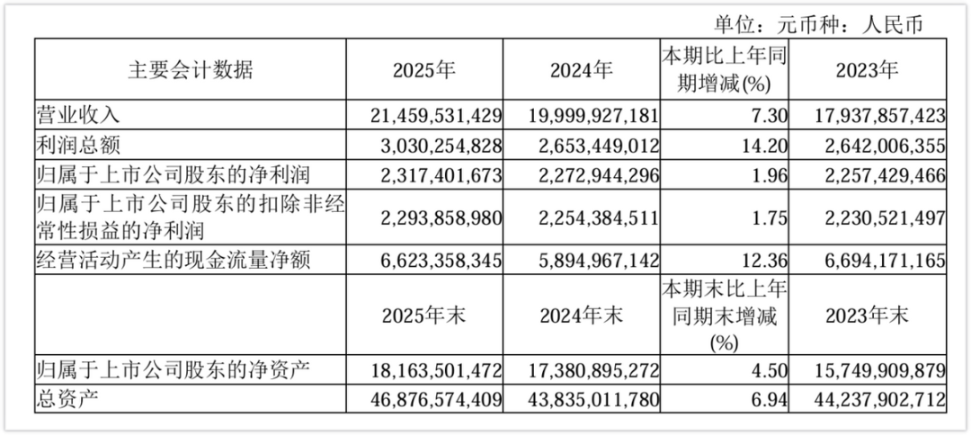 数据显示,其2025年实现营业收入214.6亿元,同比增长7.3%;归母净利润为23.17亿元,同比增长1.96%。