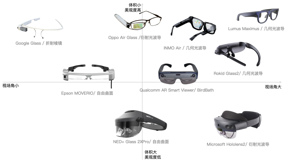 两家公司目前所有产品均配备显示屏,且走的都是衍射光波导 MicroLED路线,是实现难度最大、但理论体验感最佳的方案。