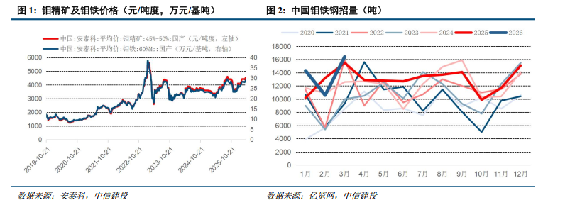 钼:根据安泰科,本周钼精矿(45%-50%)价格为4535元/吨度,较上周上升2.0%。根据亿览网,3月钼铁钢招总量约16400吨,2026Q1钼铁钢招总量为4.13万吨,同比增长6.2%。钼是军工领域的核心战略高温金属,应用于航空发动机、坦克、舰船、穿甲弹等领域,全球中高端制造业及军工领域发展将带动钼需求稳健增长。