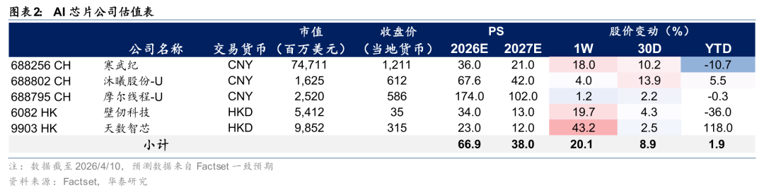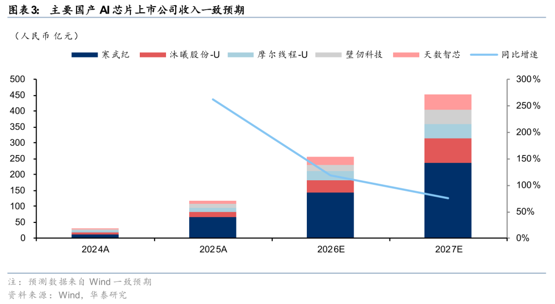 “小龙虾”的用户增长进一步验证了Agent AI对推理算力的拉动。展望2026年,5家已上市AI芯片公司Wind一致预期收入同比增长约120%到约257亿人民币,我们认为国产AI芯片正在进入由真实推理需求驱动的正循环。