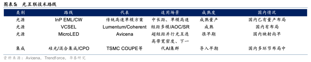 光互连演进的关键约束之一在于高性能光源。EML(电吸收调制激光器)通常在InP平台上集成激光器与调制器,是当前800G中长距可插拔光模块的重要主流方案之一,但多通道架构下对独立光源芯片需求较高,成本与供给弹性相对受限。相比之下,CW激光器 硅光外调制将光源与调制解耦,由CW光源提供连续波,数据调制则由硅光芯片上的MRM或MZM完成,这是当前CPO的主流技术路径之一。两类方案的光源端仍主要依赖III-V材料体系,尚未完全CMOS化,但硅光平台在制造与集成层面具备更强的CMOS兼容潜力。整体看,行业正处于EML、VCSEL与CW 硅光并行演进、硅光渗透率逐步提升的阶段。值得关注的是,Micro LED正作为前沿探索路径切入短距高密度互连。以Avicena为代表的方案采用GaN蓝光microLED阵列与硅PD阵列,通过数百路并行在数Gbps单通道速率下实现接近或超过1Tbps的聚合带宽;其优势在于低功耗潜力和高带宽密度,但目前更多仍处于原型验证和早期商业化阶段,系统级能效与量产可行性仍待进一步验证。
