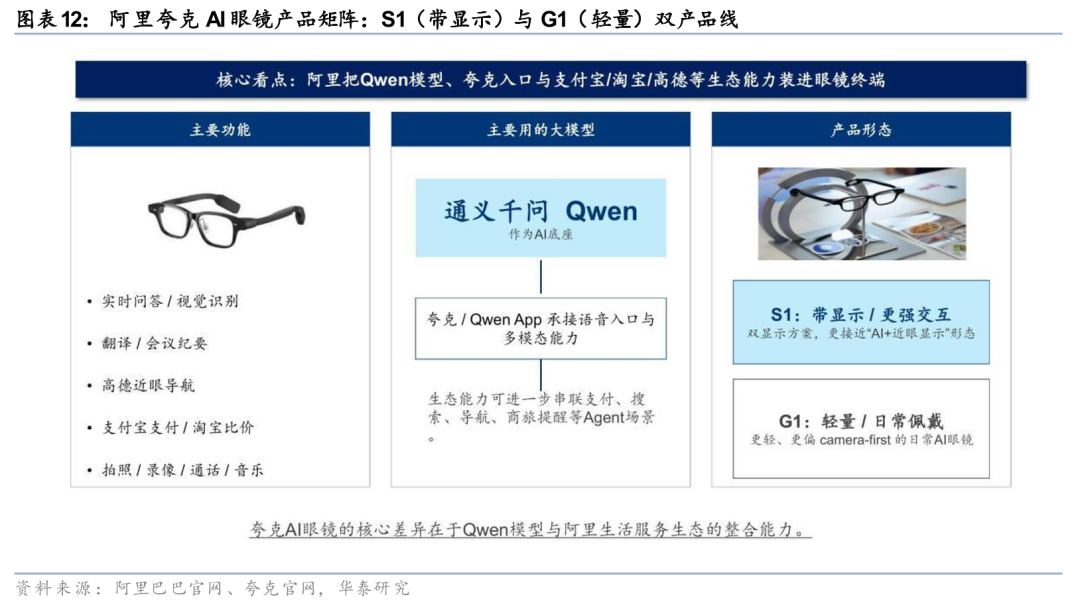阿里巴巴在AI眼镜赛道的布局具备“生态差异化”特色。阿里的策略是把Qwen模型、夸克入口与支付宝/淘宝/高德等生态能力装进眼镜终端,形成独一无二的“AI 生活服务”闭环。从产品形态看,阿里夸克AI眼镜规划了两条产品线:(1)S1——带显示/更强交互,采用双显示方案,更接近“AI 近眼显示”形态;(2)G1——轻量/日常佩戴,更轻、更偏camera-first的日常AI眼镜。