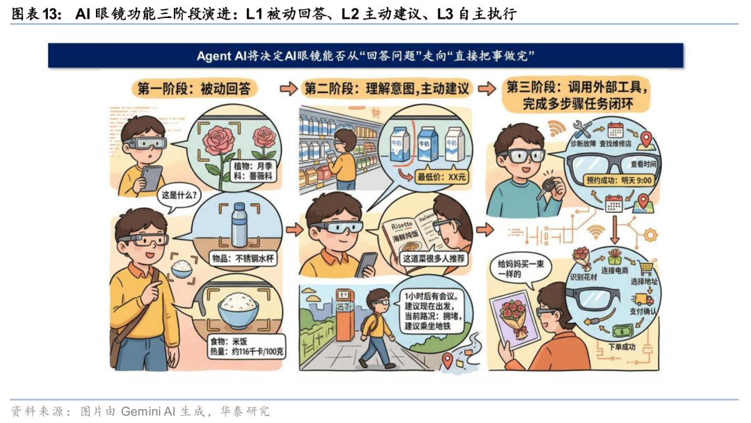 Agent AI将决定AI眼镜能否从“回答问题”走向“直接把事做完”。我们把这一演进过程划分为三个阶段: