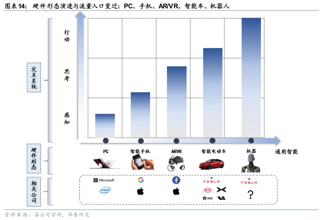 从硬件形态的演进历史看,流量入口经历了PC、智能手机、AR/VR、智能电动车、机器人的逐步升级过程。每一代硬件形态都对应着不同层次的交互系统能力:从最初的“感知”(PC键鼠输入),到“感知 思考”(智能手机触控 App),再到“感知 思考 行动”(AR/VR/智能电动车/机器人)。AI眼镜作为AR/VR形态的主要载体之一,恰好位于“感知 思考 行动”向“通用智能”过渡的关键位置。