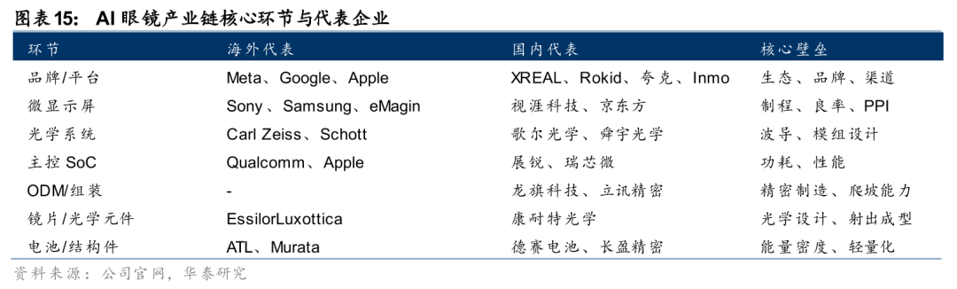我们把AI眼镜产业链的投资机会分为“品牌端”和“零部件端”两大类。品牌端关注生态位置、品牌认知度和用户留存能力;零部件端关注技术壁垒、产能扩张能力和客户关系。