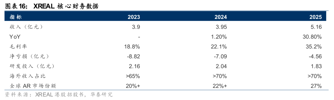 XREAL是当前全球具有代表性的AR眼镜品牌。据其港股IPO招股书披露,公司在2022-2025年连续四年位居全球AR眼镜销售收入第一,2025年全球市场份额达27%(按销售额计)。2025年实现收入人民币5.16亿元,同比增长30.8%,毛利率大幅提升至35.2%,净亏损从8.82亿元收窄至4.56亿元。海外收入占比超过70%,其中美国36.9%、日本14.6%、欧洲13.8%。