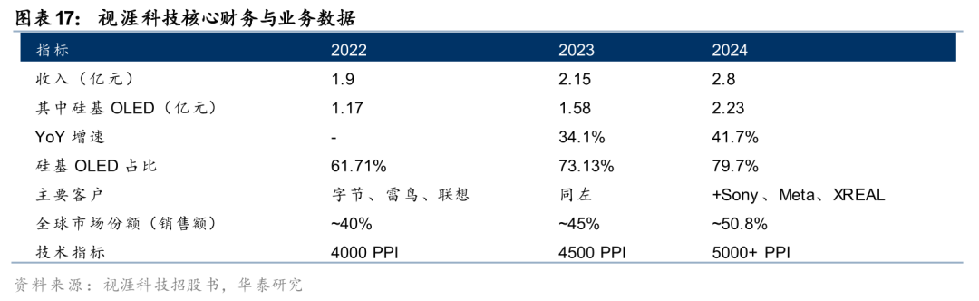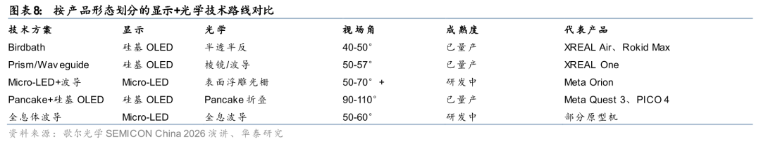 硅基OLED主导前两大品类的逻辑清晰:高端VR头显主要采用Pancake 硅基OLED方案(每台设备需双屏大尺寸微显示),有线轻量XR眼镜采用Birdbath/棱镜/波导 硅基OLED方案。Micro-LED 光波导主导无线带显智能眼镜的逻辑同样清晰:日常佩戴场景对重量(<50g)和功耗的极端要求,使得Micro-LED的高亮度、低功耗优势成为刚需。因此,硅基OLED与Micro-LED并非简单的“过渡vs.终极”关系,而是各自主导不同的产品品类。视涯科技作为全球硅基OLED龙头,在当前出货量较大的两大带显品类中保持稳固地位。
