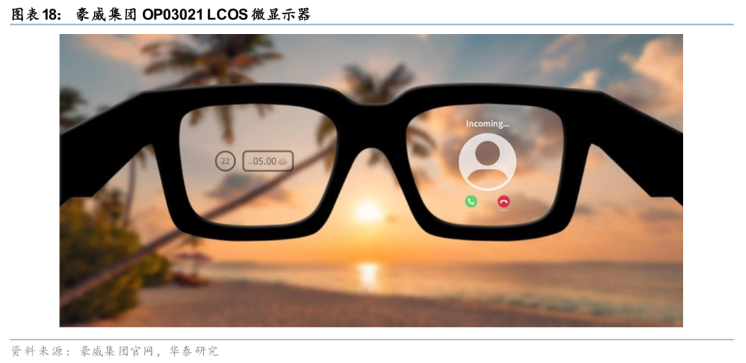 豪威集团(韦尔股份,603501 CH)是全球排名前列的半导体解决方案开发商,根据公司财报,2025年其在CMOS图像传感器领域销售额位居全球前三,同时业务覆盖模拟芯片和微显示技术。在AI眼镜领域,豪威集团的产品布局横跨感知与显示两大核心环节:CIS方面,AI眼镜对低功耗、小尺寸摄像头传感器的需求与豪威在手机前置及IoT领域积累的小像素、低功耗技术高度契合;微显示方面,公司于2025年12月发布了业界首款面向智能眼镜的超低功耗单芯片LCOS面板OP03021,采用0.26英寸光学尺寸与3.0微米像素,将阵列、驱动器和存储器集成于单芯片架构,在90Hz场序输入下实现1632×1536分辨率,预计2026年上半年量产,是目前为数不多的能够将上述功能集成于单芯片的智能眼镜LCOS方案。