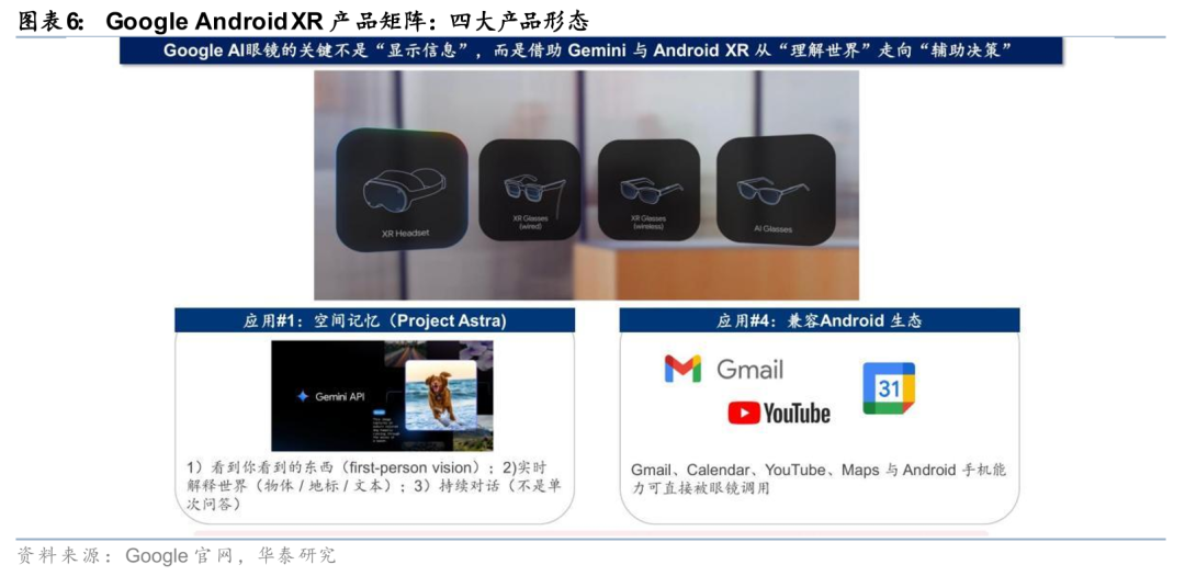 具体应用场景方面,Google AI眼镜的关键能力包括:(1)空间记忆(Project Astra)——眼镜能够“看到你看到的东西”(first-person vision),实时解释世界中的物体、地标和文本,并支持持续对话而非单次问答;(2)兼容Android生态——Gmail、Calendar、YouTube、Maps等Android原生能力可以直接被眼镜调用,无需重新开发应用;(3)Gemini模型能力——眼镜可以直接调用Gemini 2.0/2.5的多模态能力实现复杂任务。在硬件合作方面,Google已确认与Samsung(Project Moohan VR头显)、XREAL(Project Aura AR眼镜)等建立Android XR合作关系。