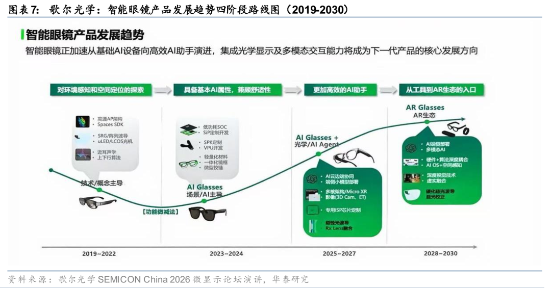 据歌尔光学在SEMICON China 2026微显示论坛的公开演讲,AI/AR眼镜产品演进可清晰划分为四个阶段:2019-2022年“技术/概念主导”(高通AP架构 阵列波导 uLED/LCOS光机);2023-2024年“AI Glasses场景/AI主导”(Meta Ray-Ban引爆无显示赛道,低功耗SOC SiP定制);2025-2027年“AI Glasses 光学/AI Agent”(AI眼镜与显示光学融合,Agent AI成为能力主线);2028-2030年“AR Glasses AR生态”(碳化硅光波导、AI端侧部署突破,完整AR生态落地)。当前行业正处于第三阶段的起点。