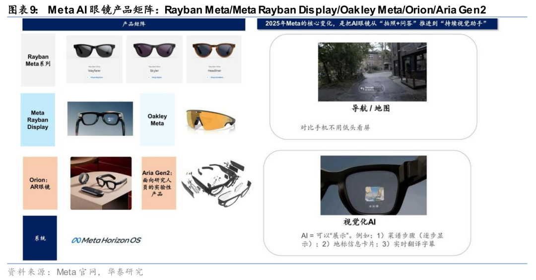 2025年Meta的核心变化,是把AI眼镜从“拍照 问答”推进到“持续视觉助手”。具体来看,Meta Ray-Ban现在已经能够实现导航/地图(眼镜直接显示导航指引,对比手机无需低头看屏)和视觉化AI(AI可以“展示”信息而不仅仅是“回答”问题,例如菜谱步骤逐步显示、地标信息卡片、实时翻译字幕等)。这一变化标志着Meta的AI眼镜正在从L1(被动回答)向L2(主动建议)过渡。