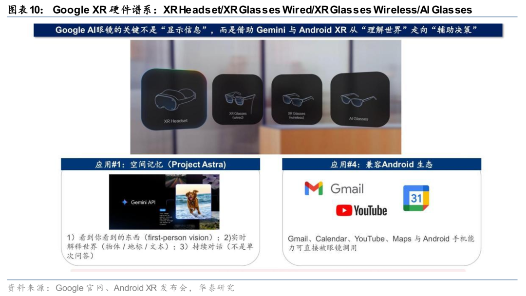 Google对AI眼镜的定位与Meta截然不同。Google不追求打造“独立爆品”,而是把AI眼镜定位为“手机的延长”,核心战略是推广Android XR生态。在Google的视角下,未来的XR硬件形态将呈现一个完整的谱系:XR Headset(VR头显,对标Meta Quest)、XR Glasses Wired(有线AR眼镜)、XR Glasses Wireless(无线AR眼镜)、AI Glasses(轻量化AI眼镜)。Google的关键优势在于,Gemini和Android XR能够让AI眼镜从“理解世界”走向“辅助决策”。