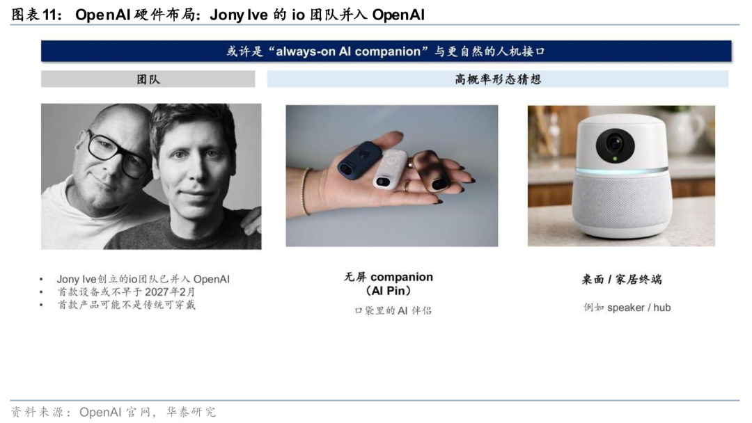 OpenAI在AI眼镜乃至更广义的AI硬件领域的布局相对神秘。据OpenAI官网,Jony Ive(前Apple首席设计官)创立的io团队已经并入OpenAI,并开始研发AI硬件设备。首款设备预计不早于2027年2月推出,首款产品可能不是传统可穿戴设备。业界对其形态的高概率猜想包括:(1)无屏AI companion(类似AI Pin)——便携式的AI伴侣设备;(2)桌面/家居终端——类似智能音箱或家庭中枢。