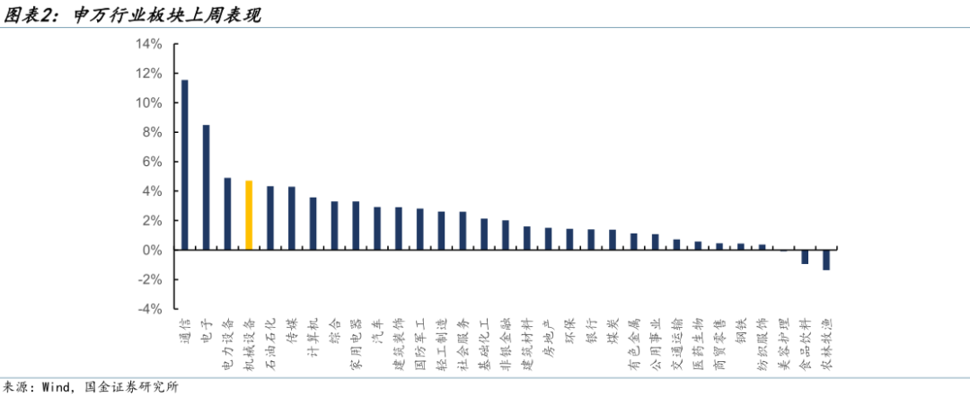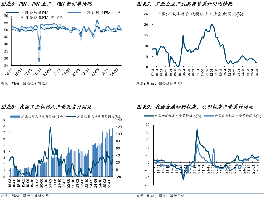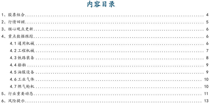 细分行业景气指标:通用机械(持续承压)、工程机械(加速向上)、船舶(下行趋缓)、油服设备(底部企稳)、铁路装备(稳健向上)、燃气轮机(稳健向上)。