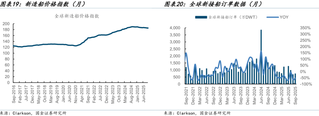 船舶景气度下行趋缓。截至2025年9月,全球新造船价格指数为185.58,新造船价格下滑趋缓。
