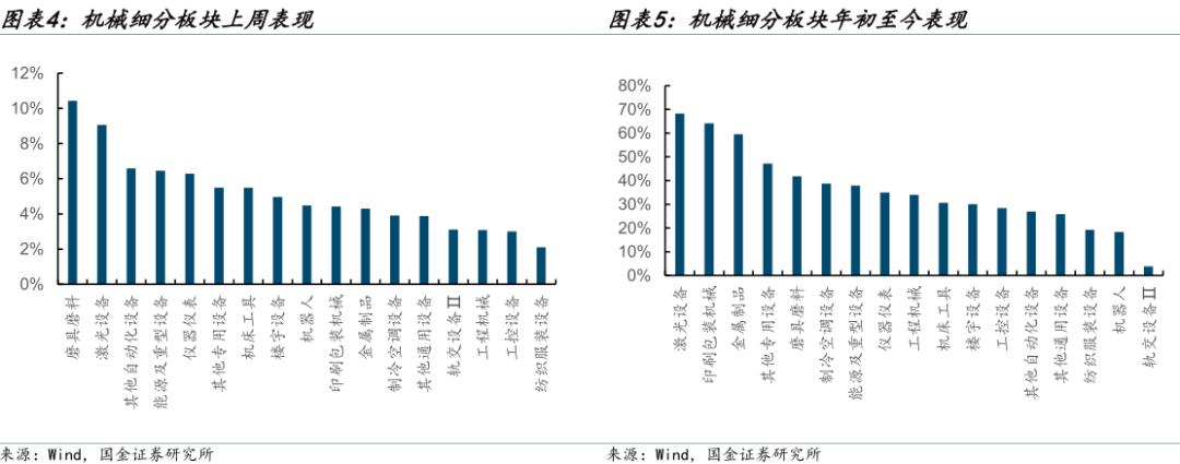 2025年至今表现:2025年初至今,机械细分板块涨幅前五的板块是激光设备/印刷包装机械/金属制品/其他专用设备/磨具磨料,涨幅分别为68.27%/64.11%/59.50%/47.16%/41.80%。