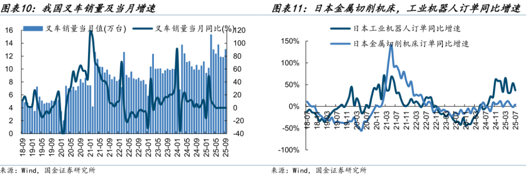 通用机械景气度持续承压。9月份制造业采购经理指数(PMI)为49.8%,连续6月低于荣枯分界线。据中国工程机械工业协会对叉车主要制造企业统计,2025年9月当月销售各类叉车130380台,同比增长23.0%。其中国内销量81119台,同比增长29.3%;出口量49261台,同比增长13.9%。
