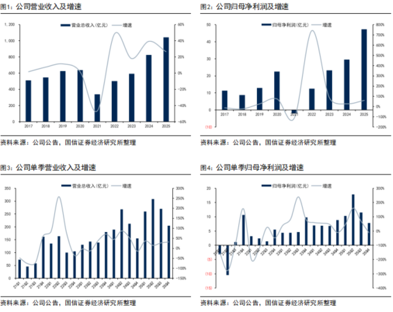 公司发布2025年年报:全年实现营收1042.87亿元,同比 26.38%;实现归母净利润47.39亿元,同比 60.57%;实现扣非净利润49.93亿元,同比 66.91%。25Q4实现营收205.04亿元,同比 32.18%;实现归母净利润7.83亿元,同比-11.57%;实现扣非净利润10.48亿元,同比 16.73%。