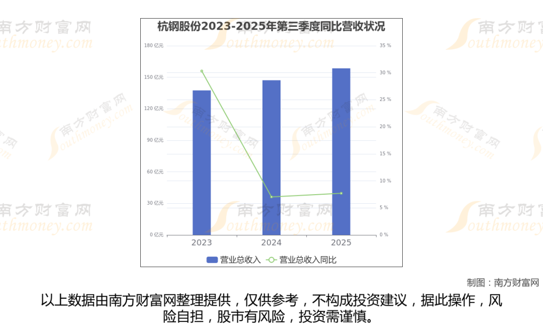 杭钢股份披露了2025年第三季度财报。报告显示(如上图),杭钢股份2025年第三季度实现营收158.48亿元,同比7.7%。