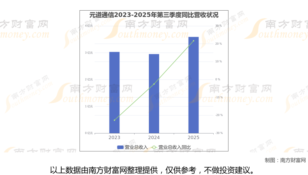 于2025年第三季度,元道通信披露了其业绩表现(如上图),其中主营业务收入3.59亿元,相较于去年同期21.66%。